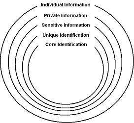 Identity knowledge is fundamentally social; it only gains relevance in a social context. (Marx, 1999) There are degrees of identity knowledge, reflecting not only the amount of information known about an individual but also different types of information about persons for some information is considered to be more sensitive or private than other information. Marx (2005) distinguished five different types of identity information, each at a certain distance from the core identity of an individual. He portrays these five types of identity information as concentric circles around an individual (see figure 1).