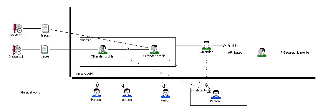 Figure : Description of a series of crimes using the concept of virtual persons. The physical and virtual worlds are separated. In the virtual world, perpetrators are not known, but their profiles can be worked on in order to point to a restricted set of potential candidates. In this example, the geographical distribution of the incidents may show a pattern typical to the behaviour of specific types of offenders.