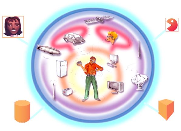Figure : A visualisation of the MultiSphere Reference Model [WWRF (2001)] showing various layers of interaction desirable in the AmI scenario