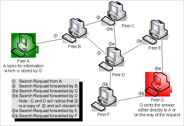 Besides the already discussed CDM for information retrieval (which implies a hybrid P2P network), the Flooded Requests Model was developed for pure P2P networks (see ). The basic idea is that each search request for a given piece of information would either be answered by a given node or this node will forward the request to all its direct neighbours. These neighbouring nodes will do the same so that in the worst case the whole P2P network gets flooded by the search request. Although this search strategy will always find the requested information (if it is available somewhere in the network) without the need for centralised directory nodes - the disadvantage of limited scalability overrules it.
