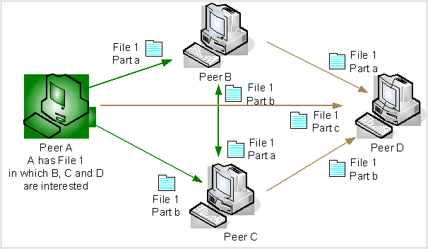 gives an example for these techniques. In a first step peer A sends parts of a file to peer B and peer C. Note that these are different parts of the same file. In a next step peer B and C can exchange their parts. Moreover A could also send an additional part to one of them. If later peer D takes part in the network, it can download simultaneously three parts of the file from A, B and C.