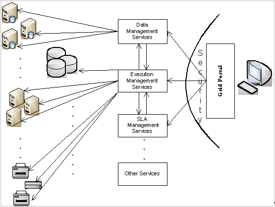 As already mentioned, the Grid requires that resources are shared beyond the local administrative domain. These resources include disk storage, memory, processing units, data, peripherals, scientific instruments, software, licenses or even individuals (e.g., experts). This dynamic collection of institutions, individuals, software and computational resources forms a new administrative domain, which is called Virtual Organisation (VO). Each entity participating in the VO must clearly and carefully specify what it wants to share, who will be allowed to share, which the sharing conditions will be. Examples of VOs are: the suppliers, distributors, stock managers, application service providers, storage service providers working in the supply chain management on one hand; the simulation systems, the models, storage service providers, technicians, engineers, involved in aerospace engineering on the other hand. Both examples include VOs which are collaboration-demanding with the first one having mainly strong requirements in data management, security and user-friendliness and the second one being computationally and data demanding. As it is clearly seen in the examples above, the purpose, the size, the structure, the lifetime and the scope of VOs may vary. Nevertheless, a thorough technical analysis of their requirements forces the identification of common concerns and requirements addressed by a set of services which implement these common core functionalities [Foster et al., (2001)]. These core functions of the Grid include execution management, data management, resource management and virtualisation, security and portals. In the following figure an example of an architecture integrating these core functionalities with a user (individual or application) accessing the Grid through the portal is depicted.