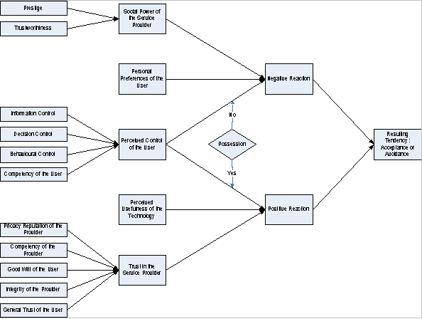 The survey also showed that higher control has a direct influence on the risk perception of the user. The answers of the participants showed that the higher the (effective) control, the lower the perceived risk, the fears that the product could be limited in use, the private sphere could be invaded and that the system could work inefficiently and consume a lot of time. It has to be noted that privacy concerns and data protection related considerations in this study are part of perceived control only, but an important one. Privacy concerns also influence indirectly others of the influencing factors shown in (: 162).