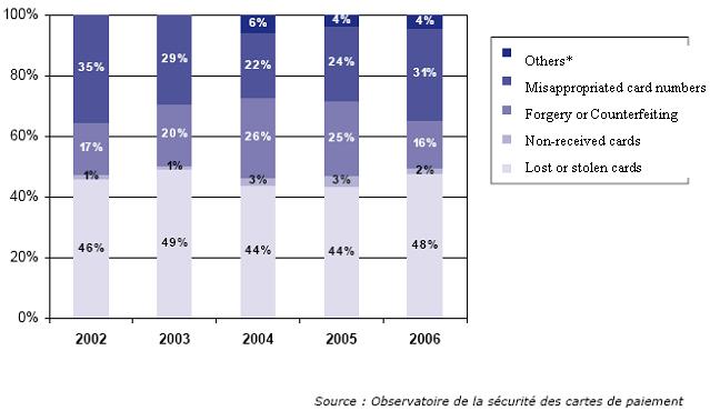 shows an increase in credit card fraud, the most important relating to card loss and theft. Counterfeiting is still the reason of 16% of fraudulent national payments. It is worth noticing that the theft of card numbers has increased between 2005 and 2006 after a 3 year-decline.