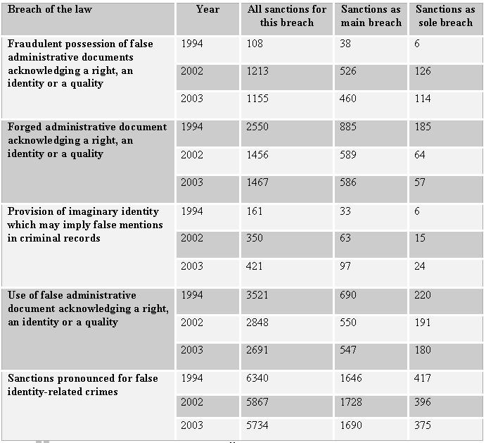 The figures relative to breaches of the law based on document fraud punished between 1994 and 2003 reveal the same tendency.