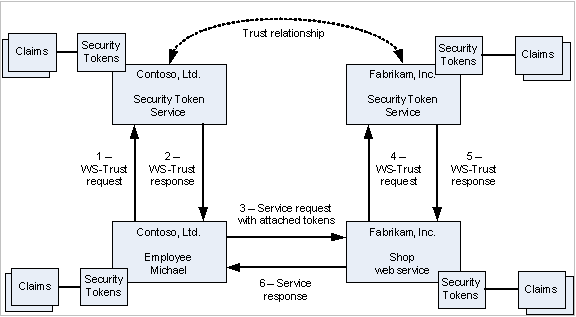 The employee’s shopping application sends a SecurityTokenRequest message to Consoto’s STS, requesting a token that will be accepted at Fabrikam (step 1): “I am employee Michael from our IT department and I have to invoke the Fabrikam shop web service at this and that address.” The claim “I am employee Michael” is proved, for instance by signing that request message with the employee’s private key or by attaching a valid Kerberos token from Contoso to the message. After internal checks (such as “Is our employee Michael authorised to buy at Fabrikam’s shop of behalf of Contoso?”), the STS from Contoso sends back a security token to Michael (step 2). That security token may include two things: It must include (a) a security token that Michael can attach to the web services invocation and it may include (b) a proof token for Michael with which he can prove that he possesses the security token. The security token may state that “The entity possessing this or that cryptographic key is an employee of Contoso and may purchase goods on our behalf”. This security token is attached to the shop message (step 3). ‘Attached’ means that the shopping request is signed with the token. The shop’s web service cannot interpret the semantics of the token, and asks the Fabrikam’s STS to validate the token (step 4). The STS from Fabrikam may return a new security token containing information like: “The owner of this or that cryptographic key is employee of one of our gold customers” (step 5). After checking that the message from step 3 is signed with the specified cryptographic key and that the security token from step 5 contains a claim that access is granted, the shop request is executed and the results are sent back to the customer (step 6).