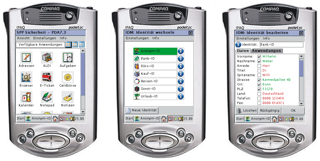 The identity configuration enables a user to choose and create a partial identity with respect to a current situation. A situation is defined by a communication partner, the current service and the current partial identity [Jen02]. Since the anonymity level cannot increase subsequently (monotony of anonymity [Wol00]) any partial identity can not be changeable. If the user wants to change the current partial identity, the iManager checks if the desired anonymity level could be reached with the intended change. Further implemented functionalities are: to edit partial identities, to store them in a secure database on the mobile device, and to recognise the current situation. The secure database stores partial identities and user’s security, his privacy policies and rules for the security tools. A filter checks the data flow of the mobile device for personal data. By this means, it is possible to fill a web form according to P3P with respect to a suitable partial identity and user’s permission.