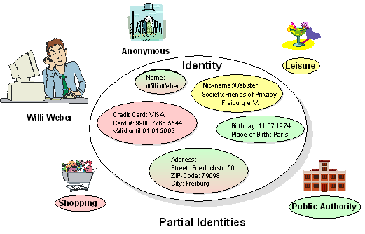 An example for using partial identities shows the following figure. The identity of the exemplary user called Willi Weber has four partial identities: anonymous, leisure, shopping, and public authority. By using a partial identity, he publishes some personal attributes, e.g. when using the partial identity public authority he publishes his name, birthday, place of birth, and his address. Whereas while using his partial identity anonymous he doe not publish any personal attribute at all. As a result, he is identifiable and he is able to establish a reputation with respect to the identity used while controlling the disclosure of his personal attributes and consequently protecting his privacy.