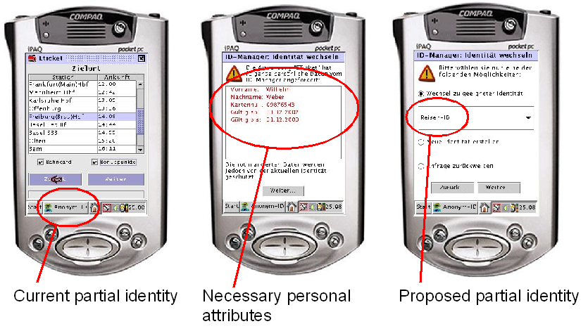 The iManager of Freiburg University, Germany, shows that it is feasible to realise privacy and security interests of a mobile user depending on the situation by managing and appearing with different partial identities. It is further developed in order to support privacy in business processes in which services are acting on behalf of the user and need access to user’s profile which is stored by another service.