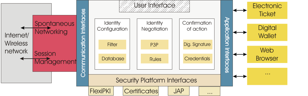 The security platform consists of interfaces to cryptographic primitives, anonymity services, to a session management, a secure database, and to security services. Anonymity services are the foundation of identity management, since it enables to user to be anonymous towards his communication partners. The anonymity service JAP [Ber00] is used for IP networks. For spontaneous networking, a library of Rostock University, Germany, [Sed01] is used. The cryptographic primitives for encryption and digital signatures are implemented by the library FlexiPKI [Buc99].