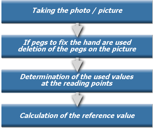 The starting point of the method is a monochrome three-dimensional picture is taken with a CCD camera. For that purpose the hand is fixed in the reader using pegs (see ). A picture resolution of 150 dpi is typically used.
