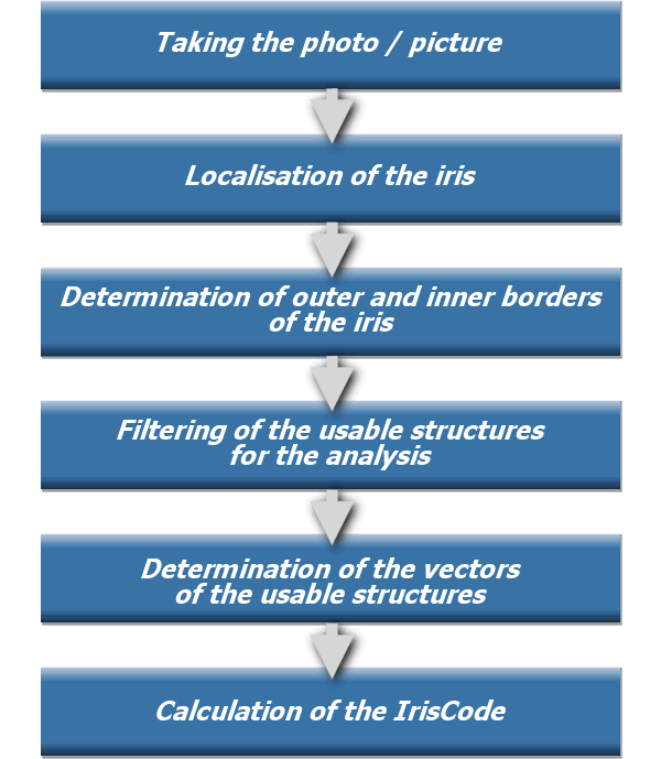 The complex structure of the iris is not genetically defined, but develops randomly in the 3rd to 8th month of pregnancy in the eye of the foetus. The structure of the iris remains constant throughout the whole life, but in the first years after birth the colour can change through further pigmentation. Today more than 400 different characteristics of these structures can be discriminated [AMB03] of which about 173 are being used for iris recognition. The likeliness that two people have identical structures of the iris is estimated to be 1:1078 [AMB03].
