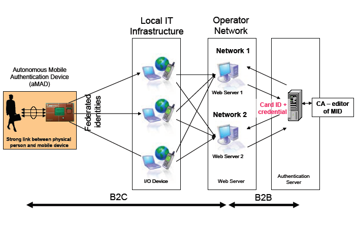 Only the last solution fulfils entirely the req. Ic, Vb and VI and IX. The availability of special hardware (biometric sensor equipment) at any authentication site is a serious restriction for the wide application of one of the two first mentioned solutions. Only the third scheme allows unrestricted mobility of the user, unlimited availability of the authentication procedure and full containment of all privacy critical biometric data inside the personal token. The last scheme allows the adoption of federated identities based on partial identity information provided by the mobile authentication token. This is important to fulfil the requirement of supporting federated identities as the interoperability of identity credentials is not guaranteed without a ubiquitous trusted PKI infrastructure. An aMAD-token may store many independent digital identity certificates to authenticate the user directly to different network IMS. The different network operators have only to trust the certification authority that edits the aMAD-tokens and the initial enrolment process. In chapter 5 a realisation of an aMAD is presented (AXS-ID-card).