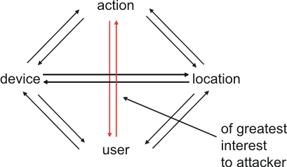 The privacy diamond is used to represent the knowledge of the attacker in the following situation: a user operates a device at a certain location to initiate an action. Four entities are necessary to model the situation: the user, the action, the location and the device. These will be addressed below. Time will only be considered as an implicit parameter.