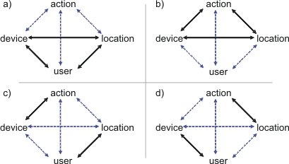 Users perform actions using a single device from a set of devices. The device is located at the same position as the user. This assumption is realistic as the user has to be in the proximity of the device to operate it.