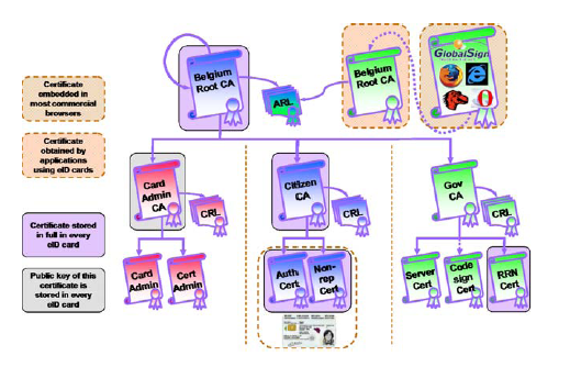 The card also holds, in addition to the two card holder certificates, three government-specific certificates: the Belgium Root CA certificate, the Citizen CA certificate, and the National Register (RRN) certificate. The overall certificate hierarchy is summarised in .