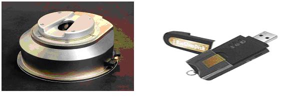 Figure : Left side: Lumidigm J110-E1 fingerprint scanner using multispectral imaging technology ; Right side: RiTech BioSlimDisk USB memory stick protected with capacitive fingerprint scanner