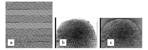 Figure : Intercepted data from the Secugen scanner, visualised using image pixels. a) A pattern is clearly visible. b) The even bytes, with proper image width. c) The odd bytes, with proper image width.