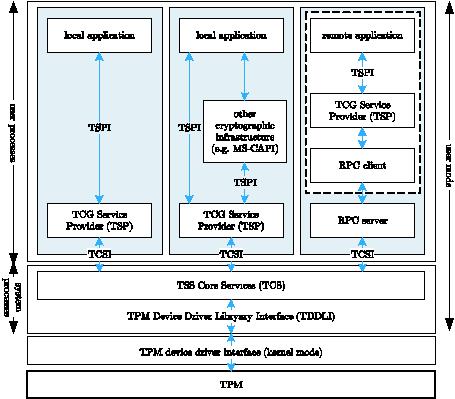 The TCG Software Stack (TSS) provides a platform independent software interface for accessing TPM functions [98]. The TSS enables the creation of interfaces for existing cryptographic APIs like MS-CAPI or PKCS#11. This enables TPM support for current and future applications that are using those APIs. In order to take full advantage of a TPM’s attestation functions, however, applications will have to support TSS directly.