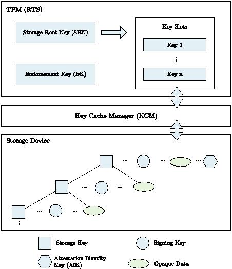 The RTS manages a small amount of volatile storage inside the TPM device that is used to hold currently used keys (key slots). Unused keys may be encrypted with a storage key and moved off the TPM chip, e.g., to a hard disk drive. The storage key might be encrypted with another storage key which leads to a key hierarchy as shown in figure 4 with the Storage Root Key (SRK) being the root. The key slots of the TPM are managed by a trusted service outside the TPM which is called Key Cache Manager (KCM).