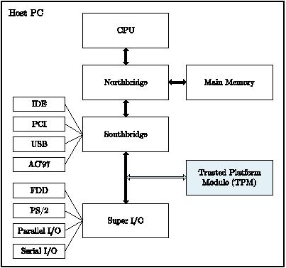 The I/O-Interface of TPMs has not been specified by the TPM Specification but has been left to the platform specific ones. The PC Specific Specification [97] recommends to use the synchronous Low Pin Count-I/O-Interface (LPC-I/O) that is available on most PC motherboards to communicate with the host PC. The connection of the TPM to the motherboard is illustrated in figure 2.