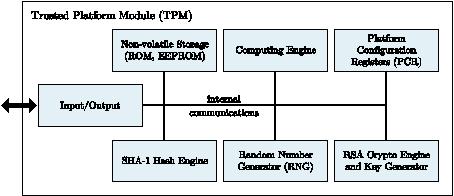 Hardware TPM devices can be compared to integrated smartcards containing a CPU, some memory, and special applications. The assumption is that the chip is tamper-evident (see section 3.1.2) and mounted on (or integrated in) the motherboard [98] such that removal is evident to visual inspection. The main chip contains a special security controller with some internally shielded memory for the firmware, non-volatile EEPROM for the data and RAM. Furthermore, it contains a cryptographic engine for accelerating RSA encryption and decryption processes, a hash accelerator and a random number generator that is needed to generate secure cryptographic keys. Figure 1 shows the main components of the chip.