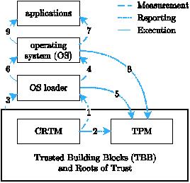 Trusted Building Blocks (TBB), like the system’s main processor (which may function as RTM), BIOS (which may act as CRTM), TPM, memory controller, RAM and the paths between those components that are necessary for integrity measurement and reporting have to be trusted. This means that they have to behave in a way that does not compromise the goals of trusted platforms.