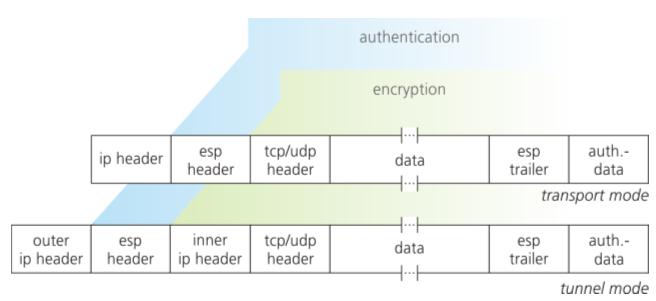 Figure : Packet structure of IPSec ESP packets in transport and tunnel mode