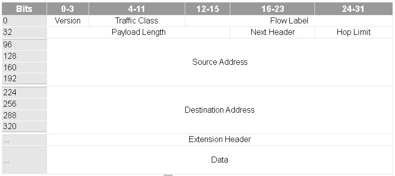 An IPv6 packet is shown in Table 10. Noticeable is that the header structure is simplified compared to the one of IPv4 packets. The source and destination address now use 128 bits. Additional fields contain information about the version, the Traffic Class (packet priority), Flow Label for QoS, Payload Length and Hop Limit to control the time to live of the packet. Noteworthy is the field Next Header. The header structure of an IPv6 packet could be simplified because of this field.
