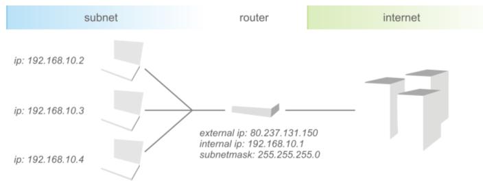 Both protocols have in common the need for unique addresses within any given subnet. A subnet is a set of devices which use one router in order to communicate with the rest of the network. A device in a subnet can be a computer or another router. To the rest of the network, all devices in a subnet are “represented” with the same external IP address. Within the subnet, the devices are differentiated by internal IP addresses, which depend on the subnet mask applied. Figure 12 illustrates a simple private network (the subnet) which is connected to the Internet by a router. Note that the router has an external IP address, to which devices from the Internet (like servers) connect. The computers in the subnet do not connect directly to the Internet, the router routes the requests and responses, thus “hiding” the infrastructure of the subnet from other hosts.