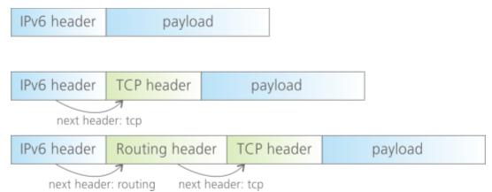 The Next Header element points to an additional header, thus enabling a header structure which adapts to the current needs of the sent packet. For example, the next header element could point to a TCP header if the payload of the IPv6 packet is a TCP packet. This feature enables routers to process packets faster and with less power, since routers only need to check and adjust header fields which are really needed. The additional headers are contained in the Extension Header field, which has a variable length. Figure 13 illustrates three different IP packets, the first without any extension header, the next with an extension header containing a TCP header and finally the third package has a TCP header as well as a routing header.