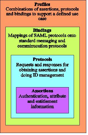 SAML is specified in terms of assertions, profiles, bindings and protocols: