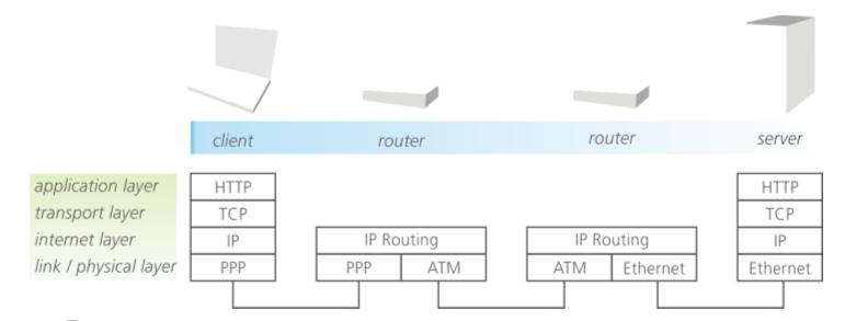 Figure : Example illustrating the involved layers of the TCP/IP model on various stages of and end-to-end communication