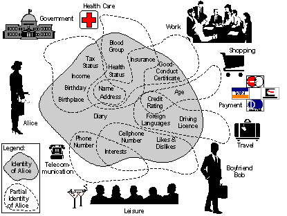 (schema: Alice’s Partial Identities (Clauß and Köhntopp, 2001), with the permission of Marit Hansen)