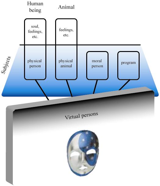 Definition 4 (Virtual Person)A virtual person is a mask defined by its attribute(s), and/or its role(s), and/or its ability(-ies), and/or its acquisition(s). The entity behind the mask, if it exists, is a subject.