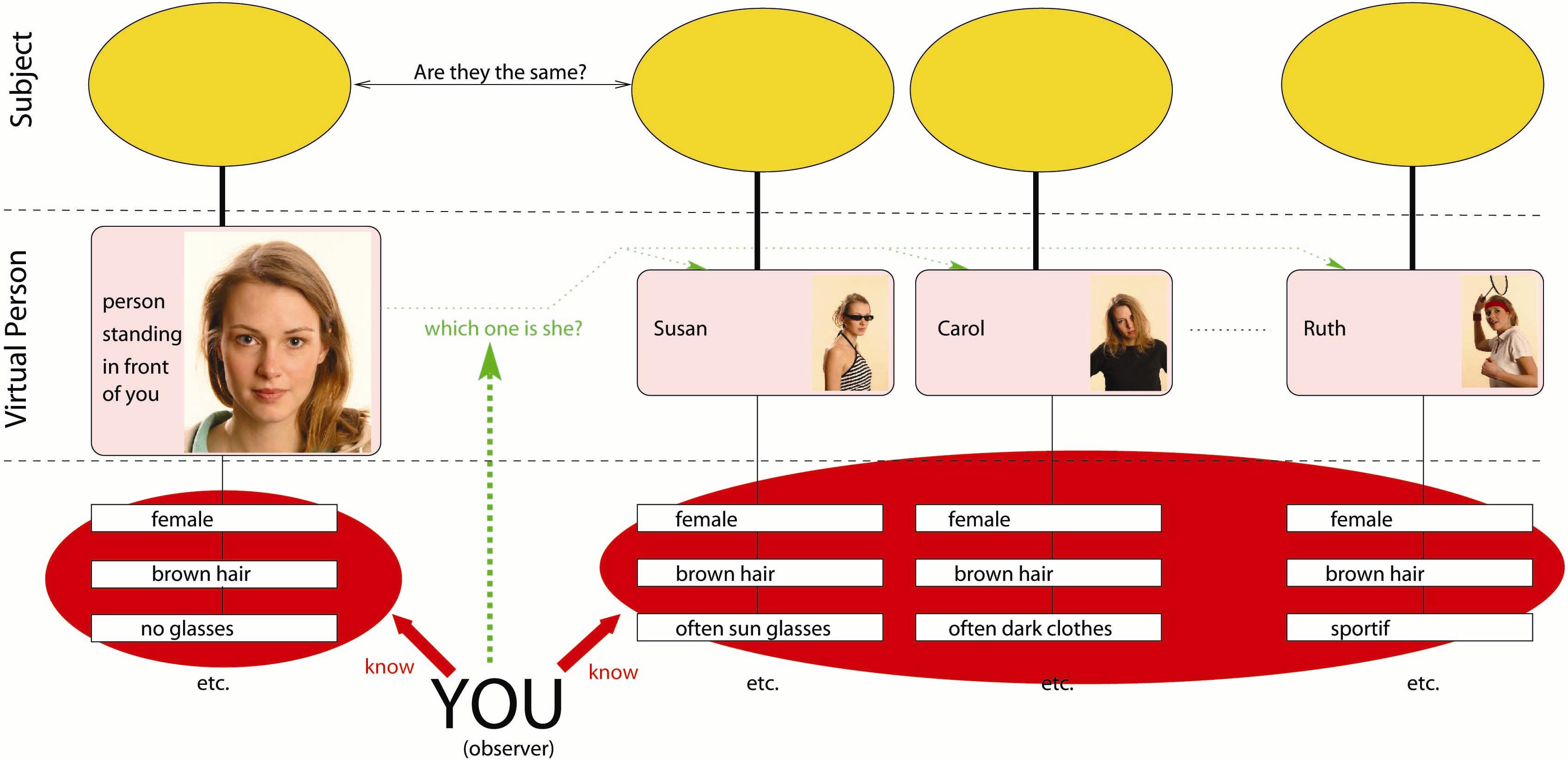 You quickly go through your memory and try to match one of the virtual persons you’ve met before with the virtual person “Person now standing in front of you”. Again, in this situation, you are the observer trying to get a link that you can trust while eliminating all the other ones.