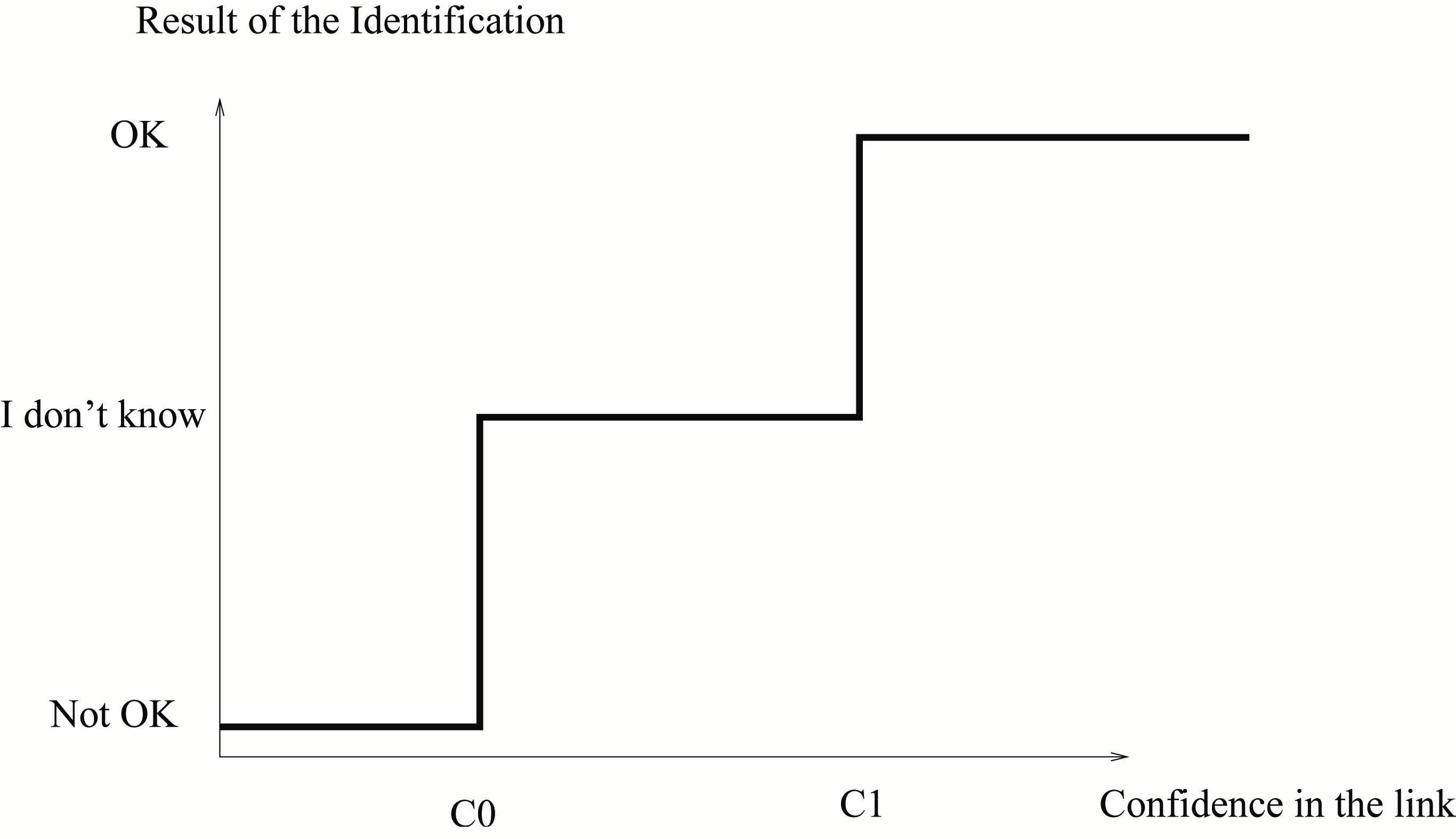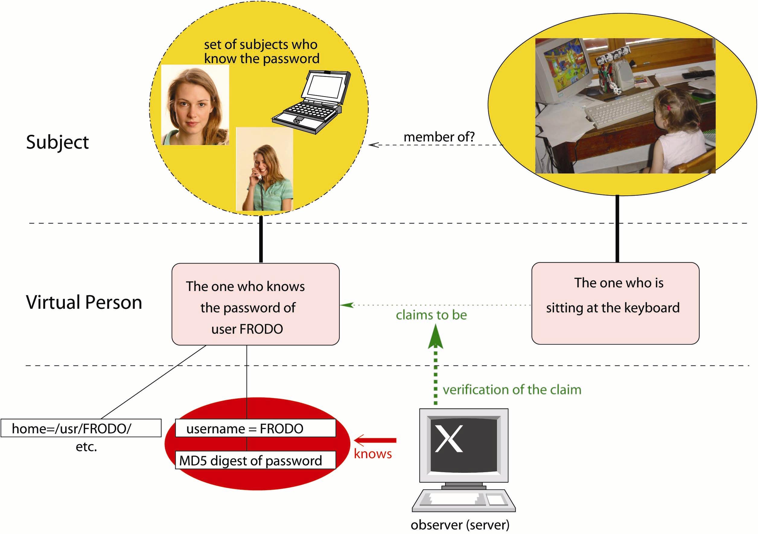 The server has to deal with two initially distinct virtual persons: the first one is the virtual person “The one who knows the password of the user FRODO”, the other one is the virtual person “The one sitting at the keyboard”. Moreover, the observer has access to some information tautologically identifying the first virtual person, e.g. an MD5 digest of FRODO’s password. The second virtual person claims to be the first one. Here the server has to check this claim, and usually will do this by asking to provide the password. The level of confidence of the server in the existence of a link between both virtual persons is high enough if and only if the password is correct.