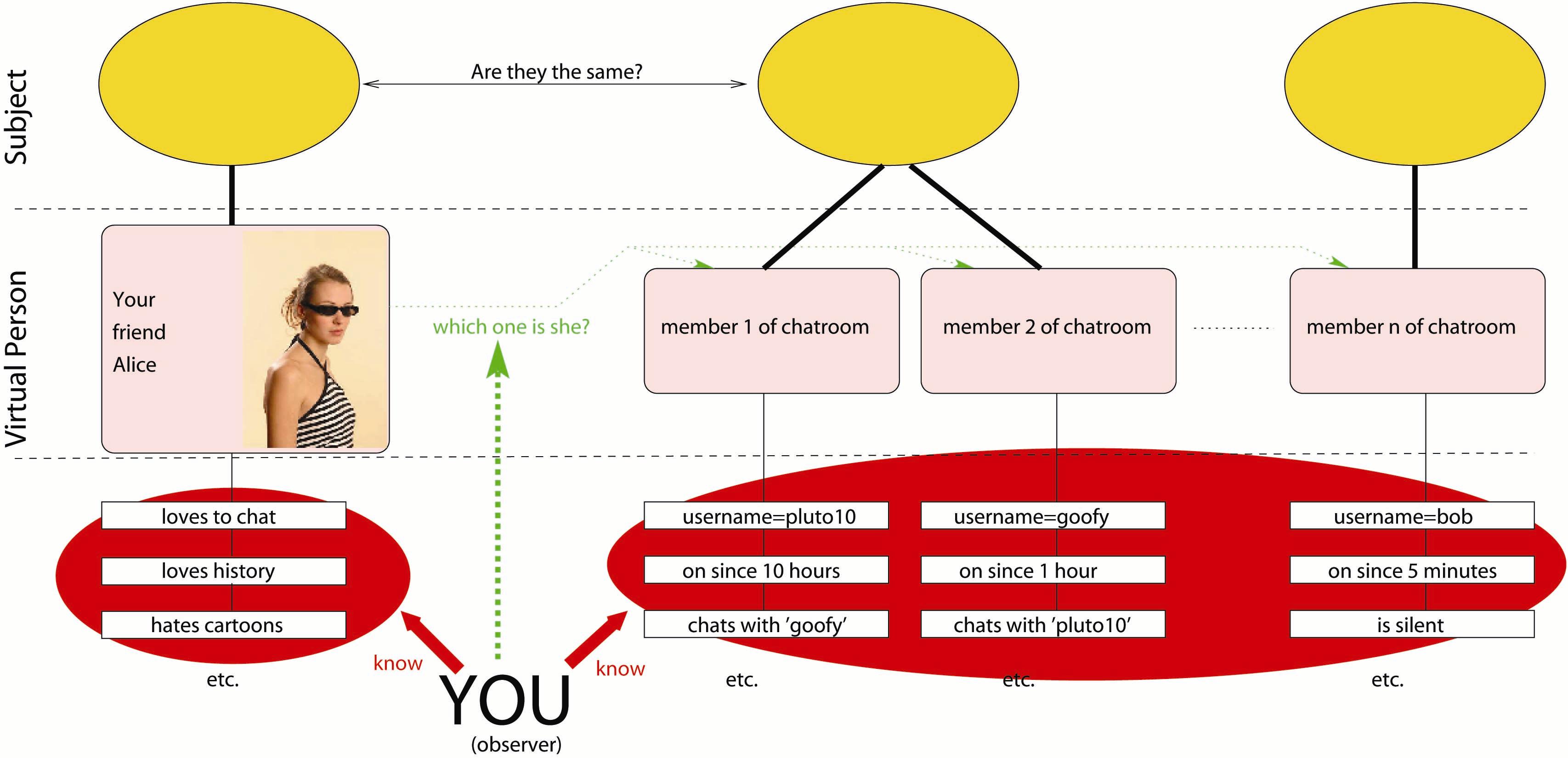 In this situation, you are the observer of the situation and the community is the set of virtual persons currently active in this chatroom. You know well the virtual person “My friend Alice” and have some information about her. In the chatroom, there are actually n different virtual persons, each one having a name (pseudonym) and some other attributes which are visible to you: for example, how long he/she has been in the chatroom, as well as the partners one specific virtual person is chatting with. You can even eavesdrop on some of the conversations going on and get information thereof. Your goal, as the observer, is now to select the virtual person(s) in the chatroom which you think matches “My friend Alice”.