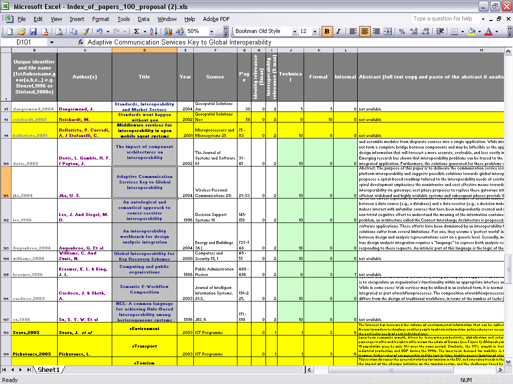 We then decided to focus on the most relevant 100 papers, discarding those which ranked lower on our scales. The final database includes the most relevant 100 papers on the topics of “interoperability” and “identity” that we found. presents a snapshot of this database.