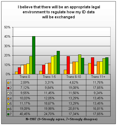 It is particularly interesting to look at the effect of the number of recent ID data transactions on expectations about an appropriate legal environment. An important difference can be discerned on the basis of whether the respondent had made a transaction or not. The majority of those who had made no transaction did not agree that there will be an appropriate legal environment, while disagreement was lower among those who had made at least one transaction. For those respondents having made at least 6 transactions, there is an important group in agreement.