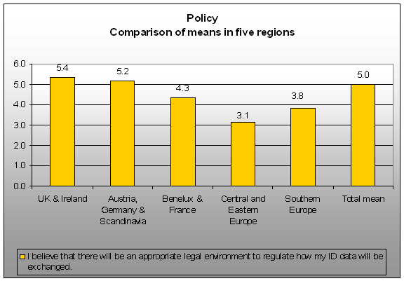 The majority of respondents did not agree that there will be an appropriate legal environment for regulating the exchange of ID data, but this area was seen in a more positive light than either ID authorities’ competence or citizen control over personal ID data, with Southern Europe below the midpoint. The mean for Central and Eastern Europe was again the lowest.