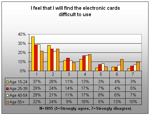 The effect of age on the perceived difficulty of card usage is relatively strong. Interestingly, the younger respondents were slightly more negative about the difficulty of the future electronic cards.