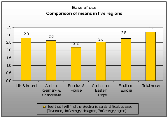 Originally, response values for the statement about usability were reversed, since respondents were asked to consider a negative statement. For the sake of clarity, the scale has been changed, so higher values mean negative attitude in this chart as well. Respondents from the UK or Ireland were the most optimistic about being able to use the electronic cards. The majority of respondents from Central and Eastern Europe thought that the future cards will be rather difficult to use.