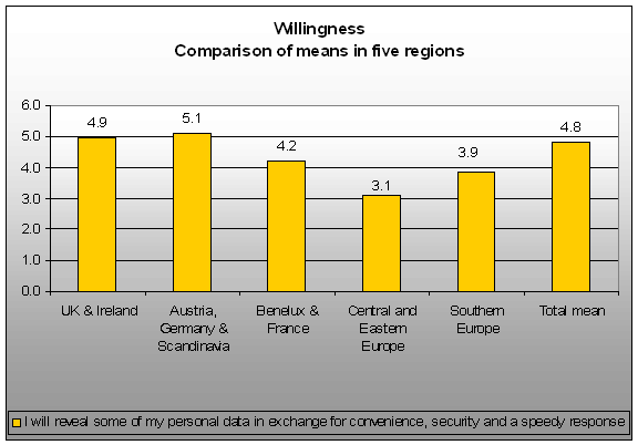 Respondents showed some willingness to reveal their personal data, with an overall mean of 4.8. Central and Eastern Europe has the lowest mean, which indicates the most positive attitude towards the system. In this question Austria, Germany and Scandinavia gain the higher mean, followed closely by UK and Ireland. Southern Europe and the group of the Benelux states and France were close to the midpoint.