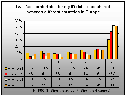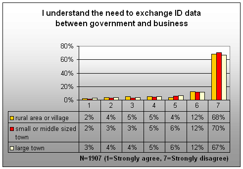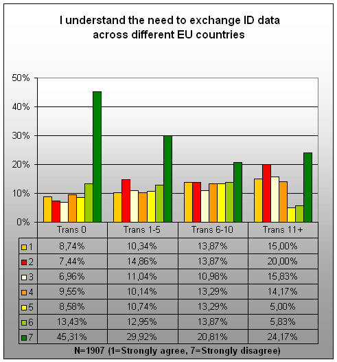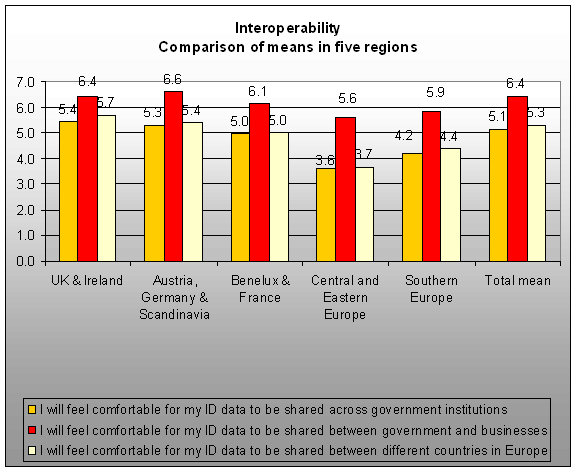 In all five regions the exchange of ID data between government and business received the highest disagreement score, with an overall mean of 6.2 on the seven grade scale. Austria, Germany and Scandinavia together were the most negative about the exchange of ID data. The overall mean of data exchange across government departments (4.4) is surprisingly positive. Data exchange between government departments as well as between different EU countries comes out well supported, especially in the new member countries and the southern part of Europe.