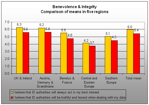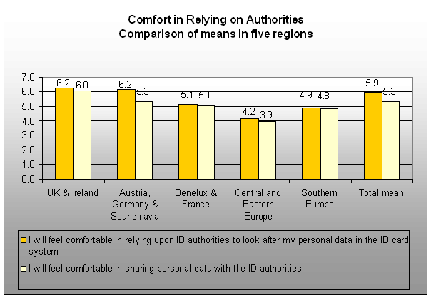 Within the group of respondents from UK and Ireland the strongest negative attitude is found in the judgement of ability to assess the benefits and risks when giving personal data to ID authorities. These respondents did not believe that the companies involved in the ID card project will be able to protect their personal data. Thus, the general level of institutional trust was very low in this region.