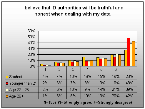 A vast majority of the respondents do not believe that the ID authorities will manage their data with goodwill. However, the respondents still studying seem to be more positive about ID authorities. The amount of ‘strongly disagree’ answers is still 28 percent in this group.
