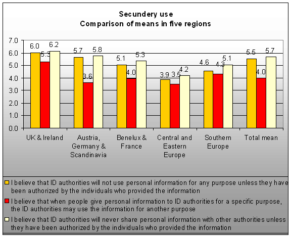 A high number of respondents rejected the unauthorized usage of personal data, and many believe that ID authorities will indeed use the personal information without permission. However the respondents were divided as to whether authorities will use personal data for a purpose different from the original, with an overall mean at the midpoint. The differences between the five regions were smaller for this specific question, only the United Kingdom and Ireland had a stronger negative response mean (5.3) while most others notably Austria, Germany and Scandinavia tend to trust slightly more their governments.