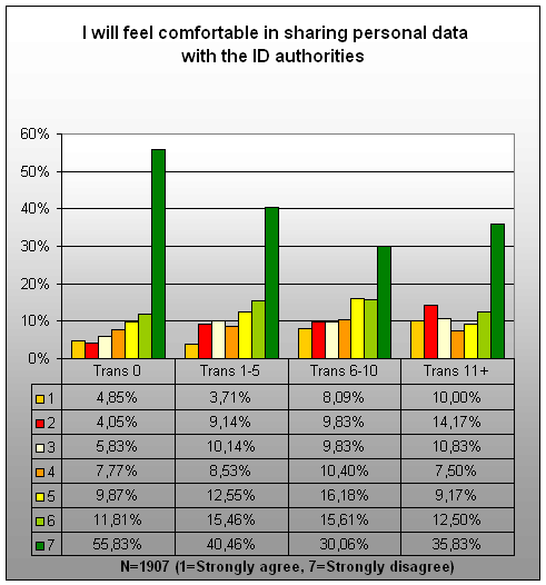 The questions about trust received a negative overall evaluation. The mean of responses about the ID authorities’ effort to look after personal data received 5.9 score overall on the seven point scale. Some of the respondents were more positive about sharing their data with the authorities. UK and Ireland showed a high mean in both questions, while the respondents from new EU member states were the most optimistic.