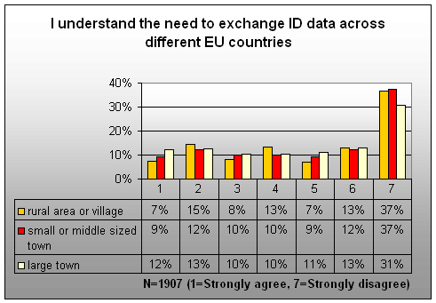 The vast majority of the respondents did not agree with the need to exchange ID data within the EU. In this particular question it is interesting to examine the effect of home settlement size. In the rural area, the amount of strong disagreement was higher than in large towns.
